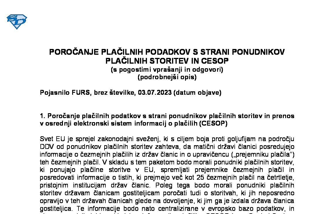 Smernice za sporočanje plačilnih podatkov s strani ponudnikov plačilnih storitev in prenos v osrednji elektronski sistem informacij o plačilih (CESOP).pdf Navodilo o obliki, vsebini in načinu dostave podatkov, ki jih sporočajo ponudniki plačilnih storitev finančni upravi Republike Slovenije.docx |