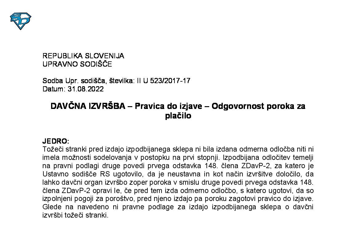 ODLOŽITEV IZVRŠBE ODLOČBE FURS – Neposredna grožnja nelikvidnosti, plačilne nesposobnosti in kapitalske neustreznosti (I U 938/2025-4) 10.06.2025 09.12.2025