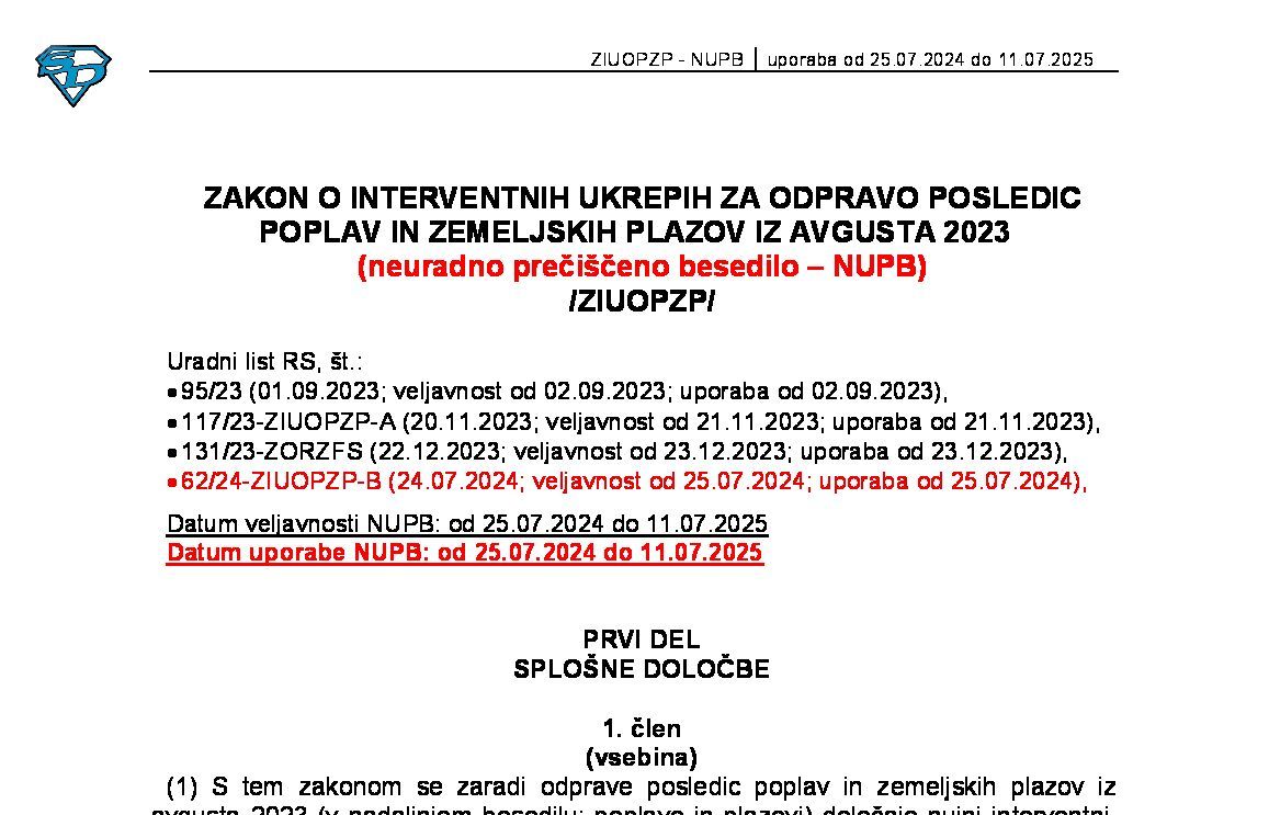 ZAKON O INTERVENTNIH UKREPIH ZA ODPRAVO POSLEDIC POPLAV IN ZEMELJSKIH PLAZOV IZ AVGUSTA 2023 (ZIUOPZP - neuradno prečiščeno besedilo) 12.07.2025 01.07.2025