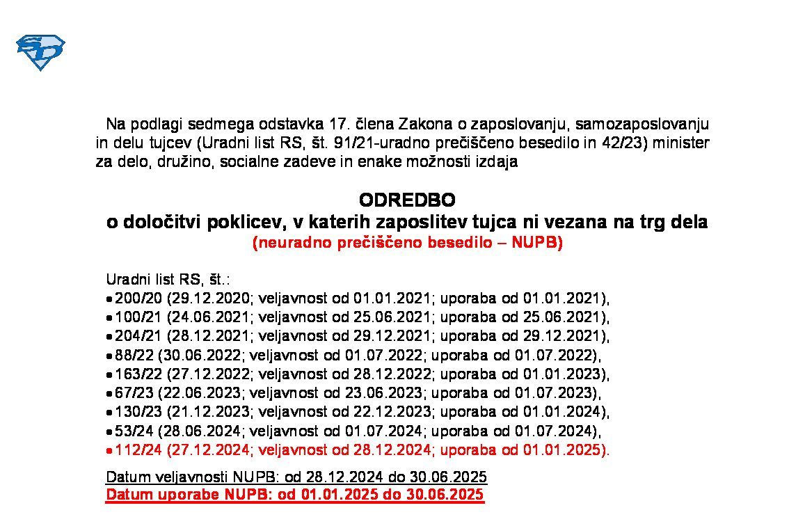 Odredba o določitvi poklicev, v katerih zaposlitev tujca ni vezana na trg dela (NUPB - neuradno prečiščeno besedilo) 01.07.2025 05.12.2025 01.07.2025