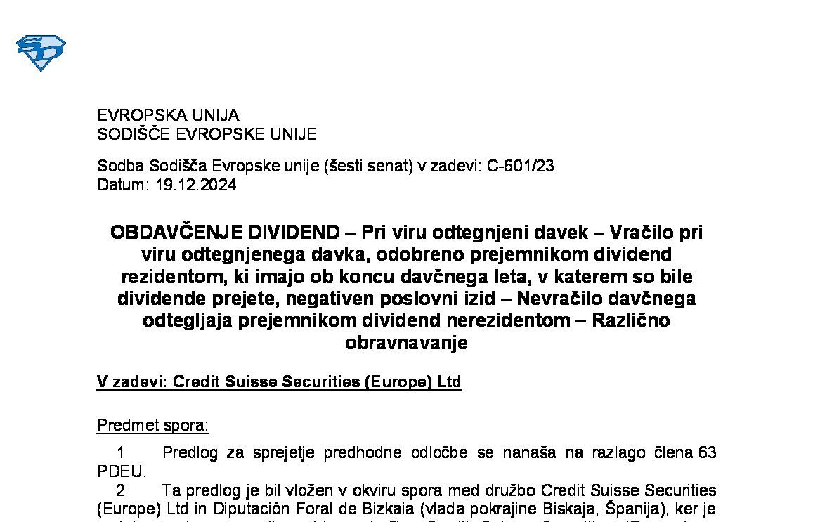 SKUPNI SISTEM OBDAVČITVE MATIČNIH DRUŽB IN ODVISNIH DRUŽB IZ RAZLIČNIH DRŽAV ČLANIC – Oprostitev DDPO od dividend, ki jih odvisna družba nerezidentka razdeli matični družbi rezidentki (C-228/24) 03.04.2025 07.04.2025