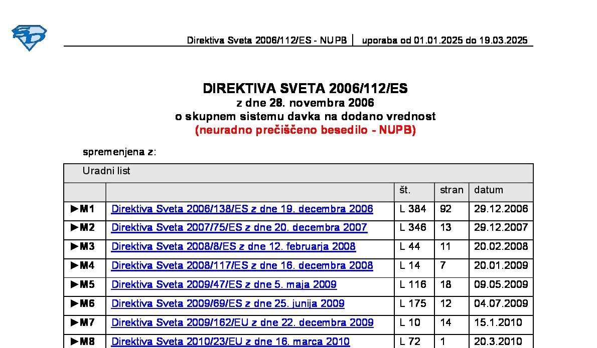 DIREKTIVA SVETA 2006/112/ES z dne 28.11.2006 o skupnem sistemu DDV (neuradno prečiščeno besedilo - NUPB) 20.03.2025 13.04.2025 30.03.2025