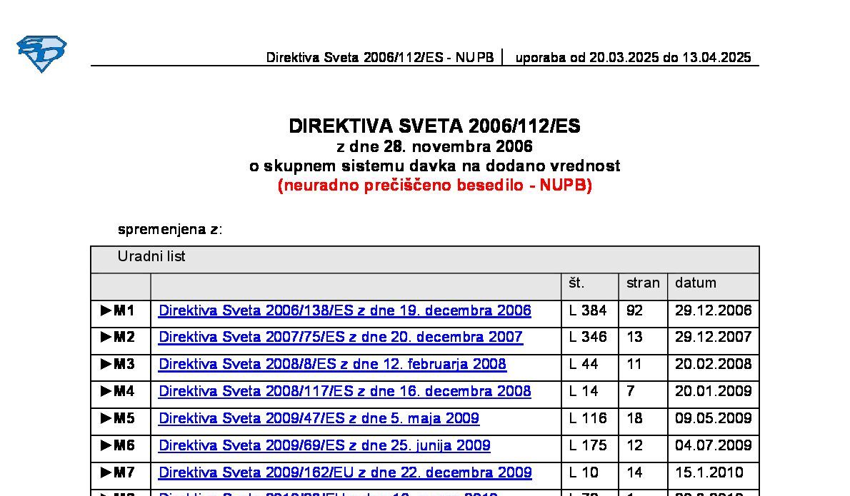 DIREKTIVA SVETA 2006/112/ES z dne 28.11.2006 o skupnem sistemu DDV (neuradno prečiščeno besedilo - NUPB) 01.01.2025 19.03.2025 20.01.2025