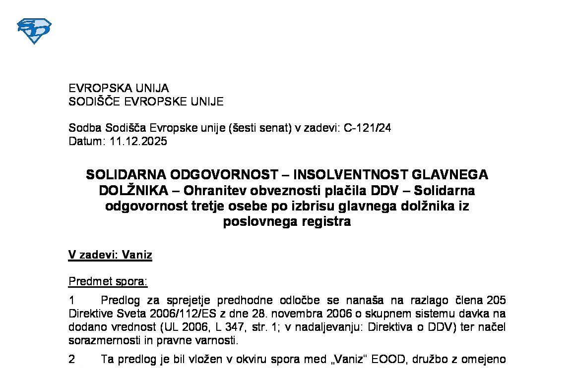 POJEM DAVČNI ZAVEZANEC – DRUŽBENIKI DRUŽBE CIVILNEGA PRAVA BREZ PRAVNE OSEBNOSTI – Določitev davčnega zavezanca, ki je dolžan plačati davek (C-796/23) 11.12.2025 15.12.2025