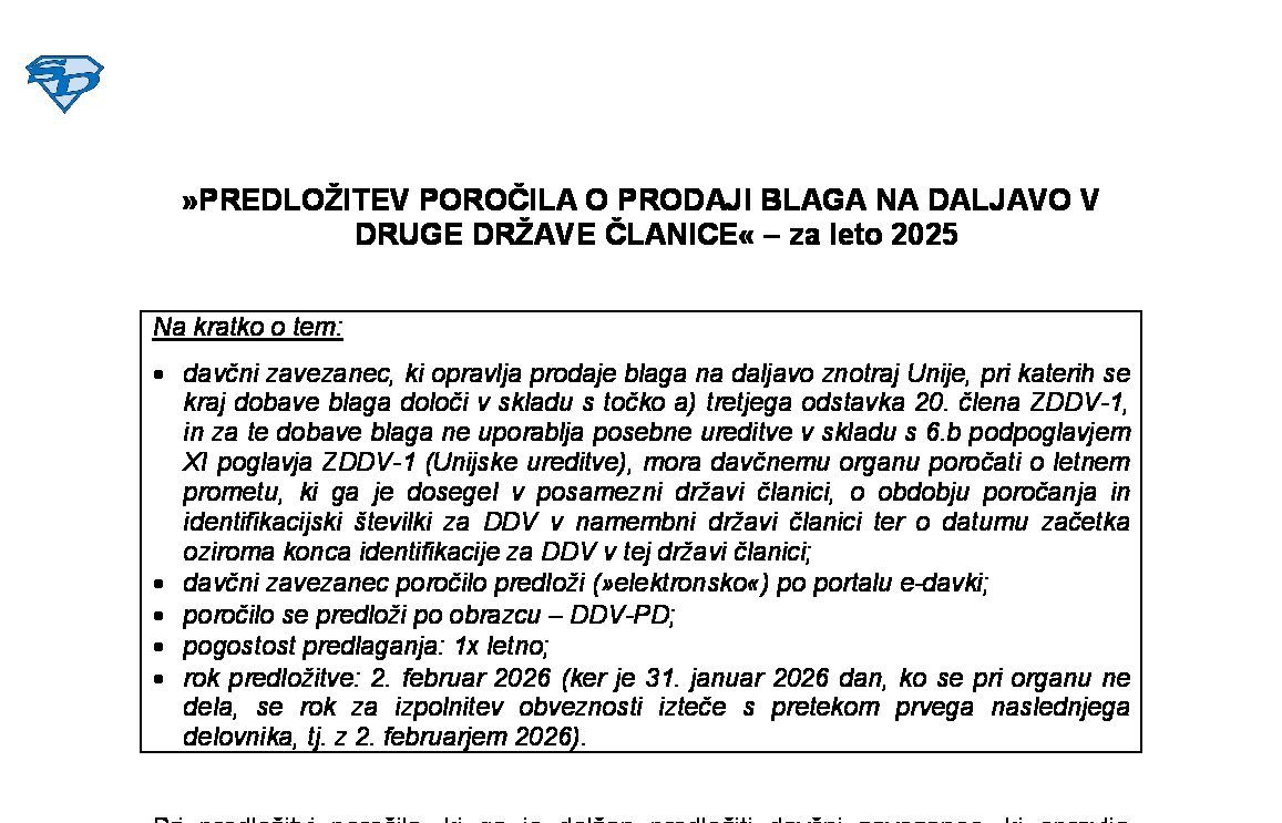 PREDLOŽITEV POROČILA O SKUPNI VREDNOSTI DOBAV BLAGA NA DALJAVO IN OPRAVLJENIH (TBE) STORITVAH IZ 30.f ČLENA ZDDV-1 – za leto 2025 16.12.2025