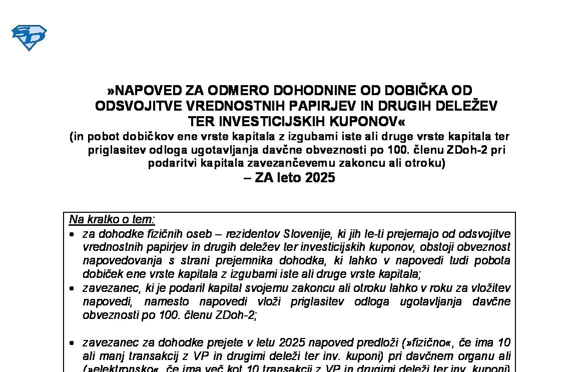 NAPOVED ZA ODMERO DAVKA OD DOBIČKA OD ODSVOJITVE IZVEDENIH FINANČNIH INSTRUMENTOV (DDOIFI) - ZA leto 2025 02.02.2026
