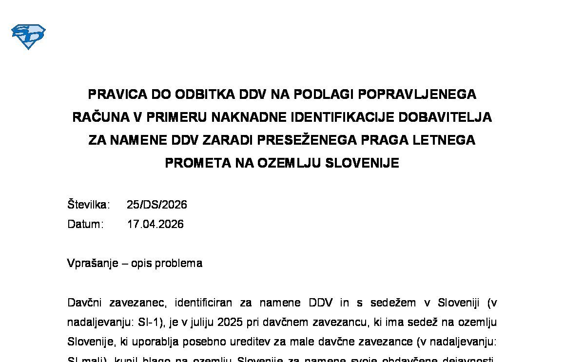 ATIPIČNI DAVČNI ZAVEZANEC, IDENTIFICIRAN ZA DDV IZKLJUČNO ZARADI PREJEMANJA STORITEV, IZVEDE PRIDOBITEV BLAGA IZ EU – Prag 10.000 EUR ni presežen – Ali lahko kljub temu uporabi DDV številko za pridobljeno blago in obračuna DDV v Sloveniji? 21.04.2026 21.04.2026
