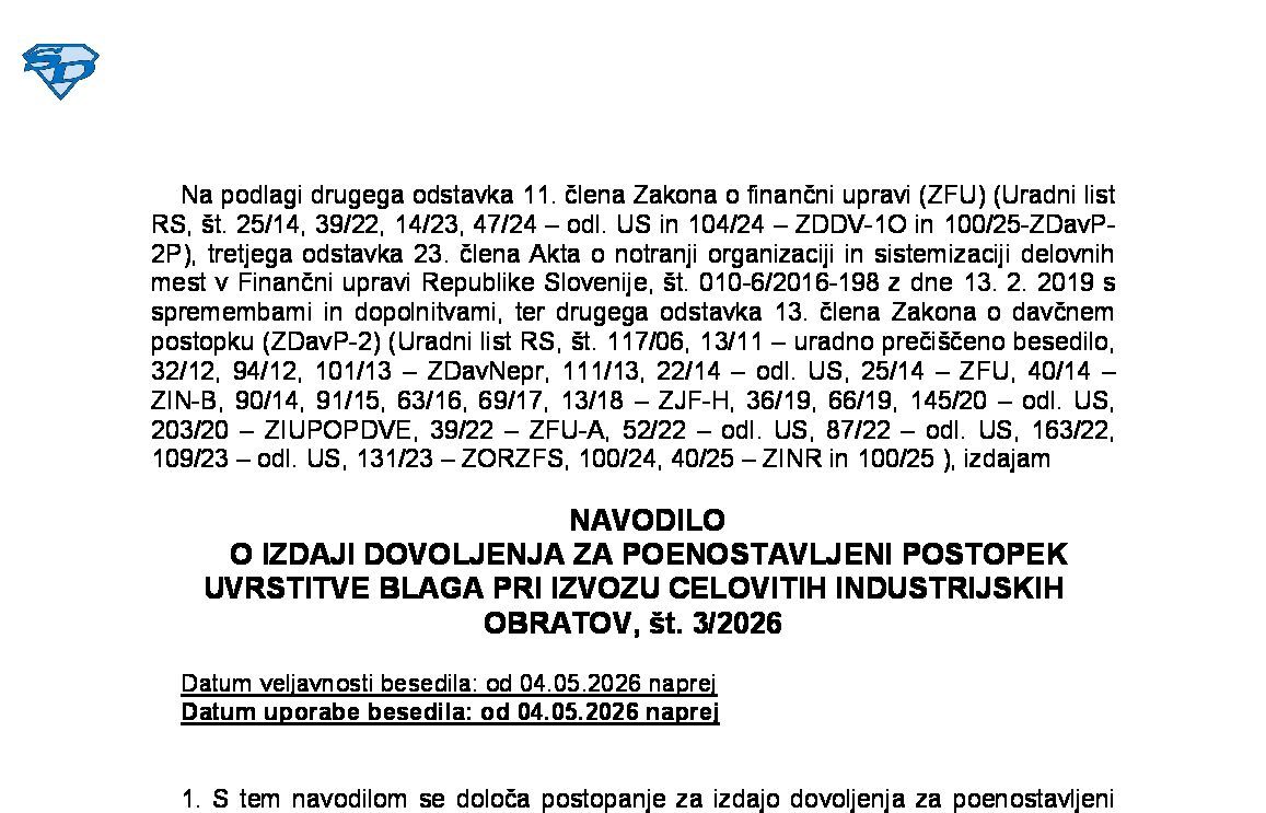 NAVODILO o tarifnih opustitvah, št. 2/2026 10.04.2026 10.04.2026