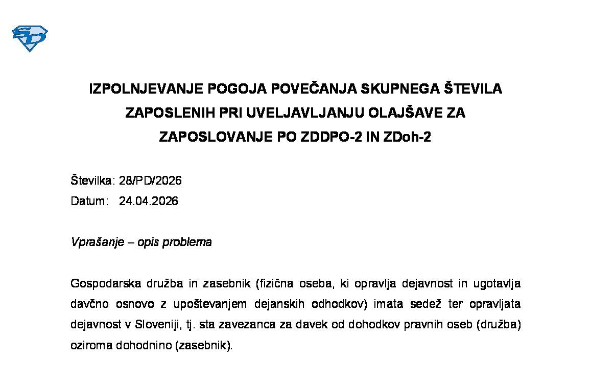 OLAJŠAVA ZA ZAPOSLOVANJE – Dohodnina iz dejavnosti in davek od dohodkov pravnih oseb 09.04.2026 09.04.2026