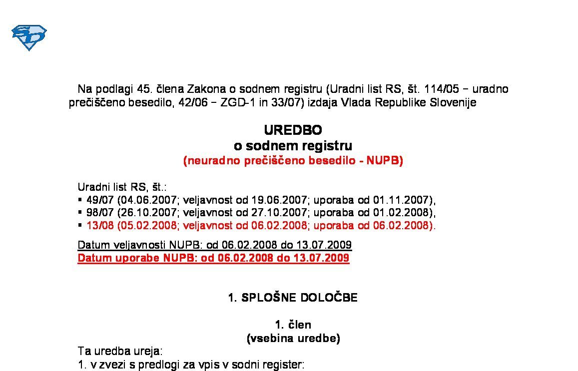 | Uredba o sodnem registru (NUPB - neuradno prečiščeno besedilo) | 10.08.2024 | [!] | 01.08.2024 | |