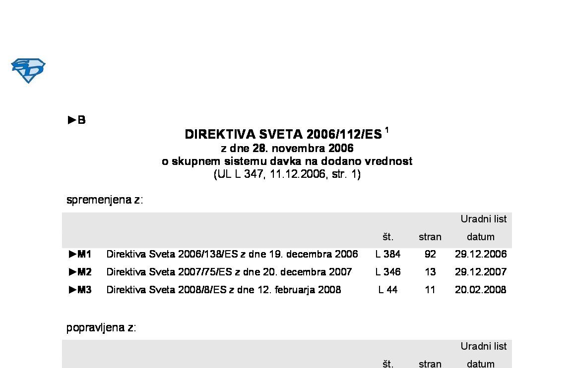 | DIREKTIVA SVETA 2006/112/ES z dne 28.11.2006 o skupnem sistemu DDV (neuradno prečiščeno besedilo - NUPB) | 01.01.2025 | 19.03.2025 | 20.01.2025 | |
