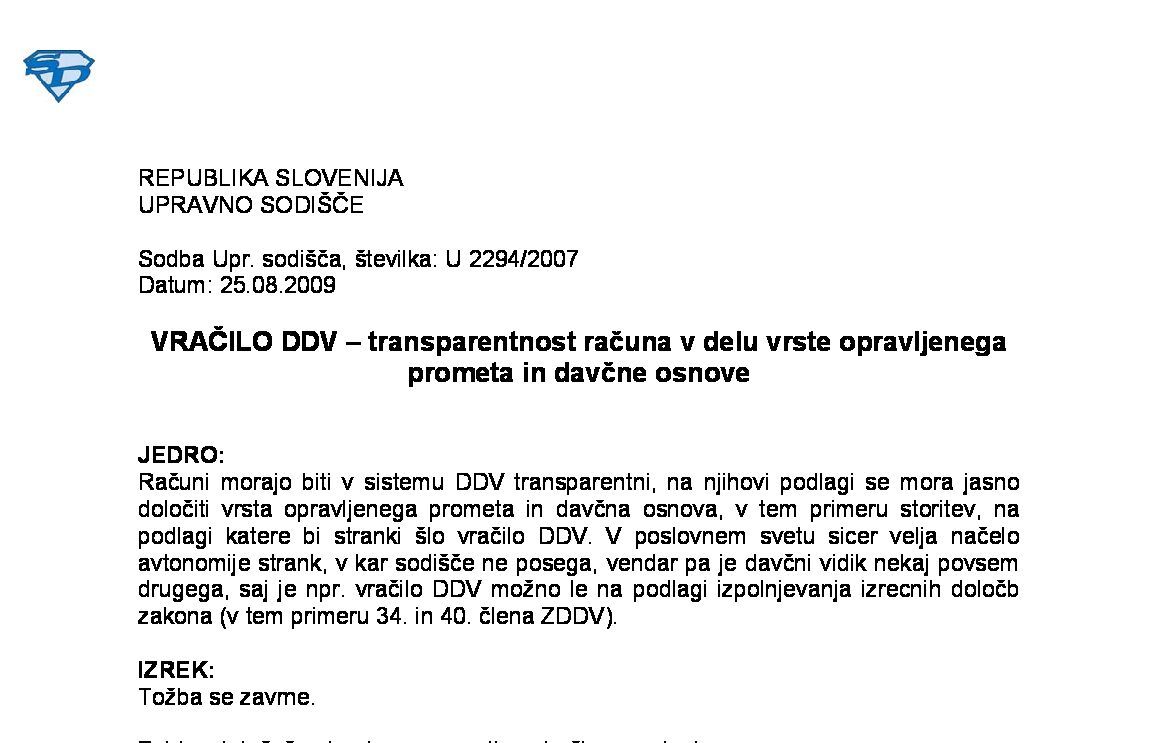 IZPOLNJEVANJE POGOJEV ZA DOBAVO BLAGA ZNOTRAJ UNIJE, OPROŠČENO PLAČILA DDV NA PODLAGI 46. ČLENA ZDDV-1 – Nepopolne CMR listine (I U 1704/2021-38) 27.11.2024 15.10.2025