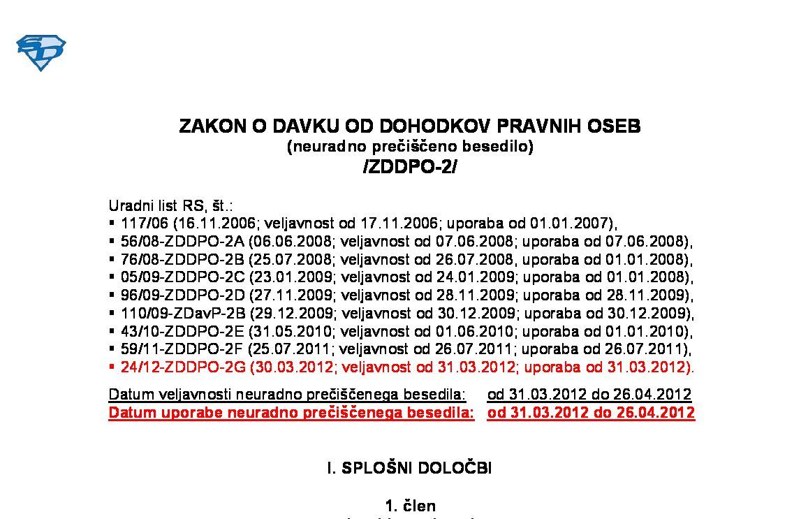 | ZAKON O DAVKU OD DOHODKOV PRAVNIH OSEB (ZDDPO-2 - neuradno prečiščeno besedilo) | 01.01.2024 | [!] | 31.12.2024 | 12.02.2024 |