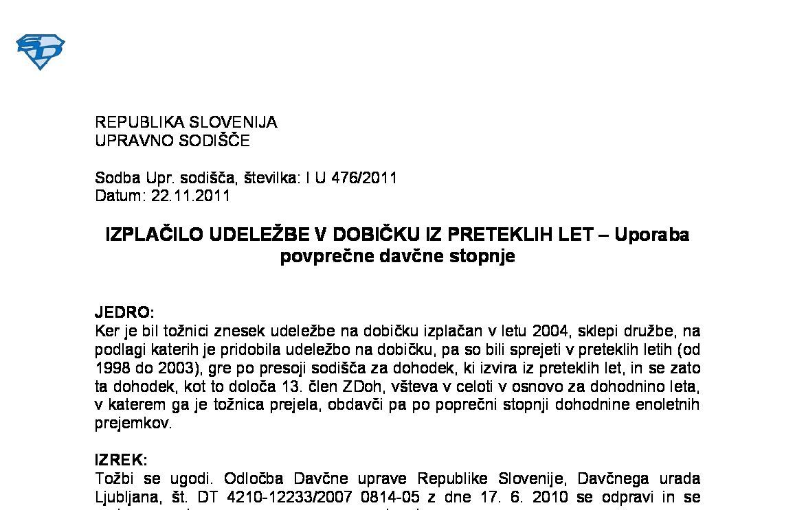 PREJEM POSLOVNEGA DELEŽA V DRUŽBI OB ANGAŽIRANJU PRI SANACIJI DRUŽBE – Darilo, ki se obdavčuje po ZDDD, ali dohodek obdavčen po ZDoh-2 (I U 1495/2022-13) 20.11.2024 10.07.2025